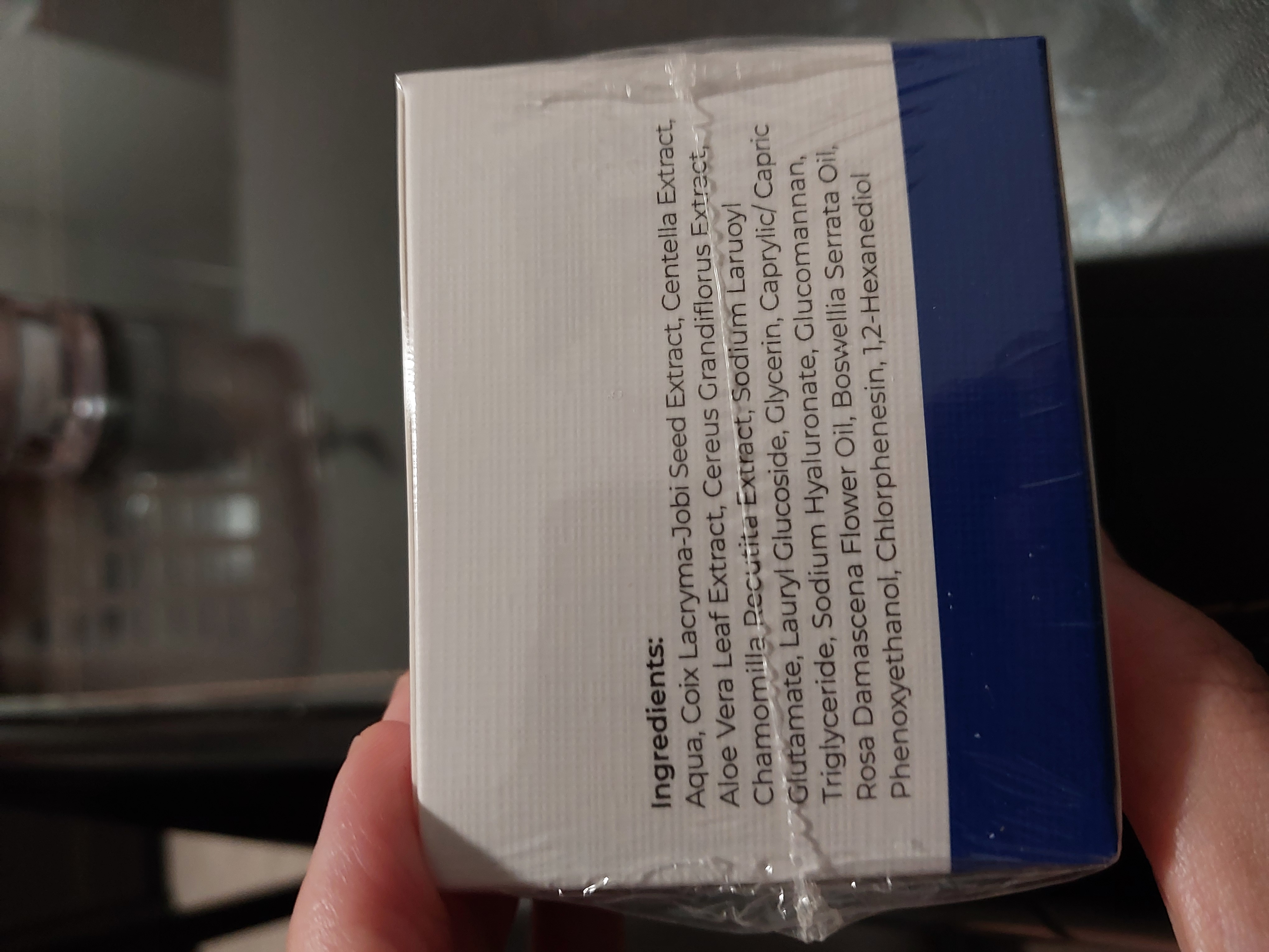 Aqua, Coix Lacryma-Jobi Seed Extract, Gotu Kola Extract, Aloe Vera Leaf Extract, Cactus Extract, Chamomilla Recutita Extract, Sodium Lauroyl Glutamate, Lauryl Glucoside, Glycerine, Caprylic/Capric Triglyceride, Sodium Hyaluronate, Rosa Damascena Flower Oil, Boswellia Serrata (Frankincense) Oil, Phenoxyethanol, Chlorphenesin, DL-1,2-Hexanediol
